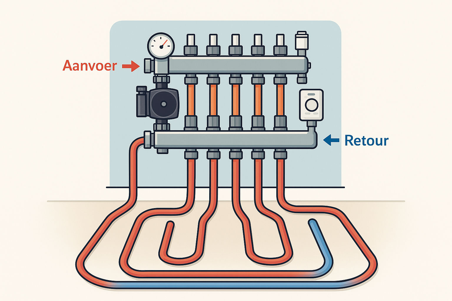 - Warm water aanvoer: de verdeler ontvangt warm water van je warmtebron, zoals een cv-ketel (70°C), warmtepomp (35°C) of stadsverwarming