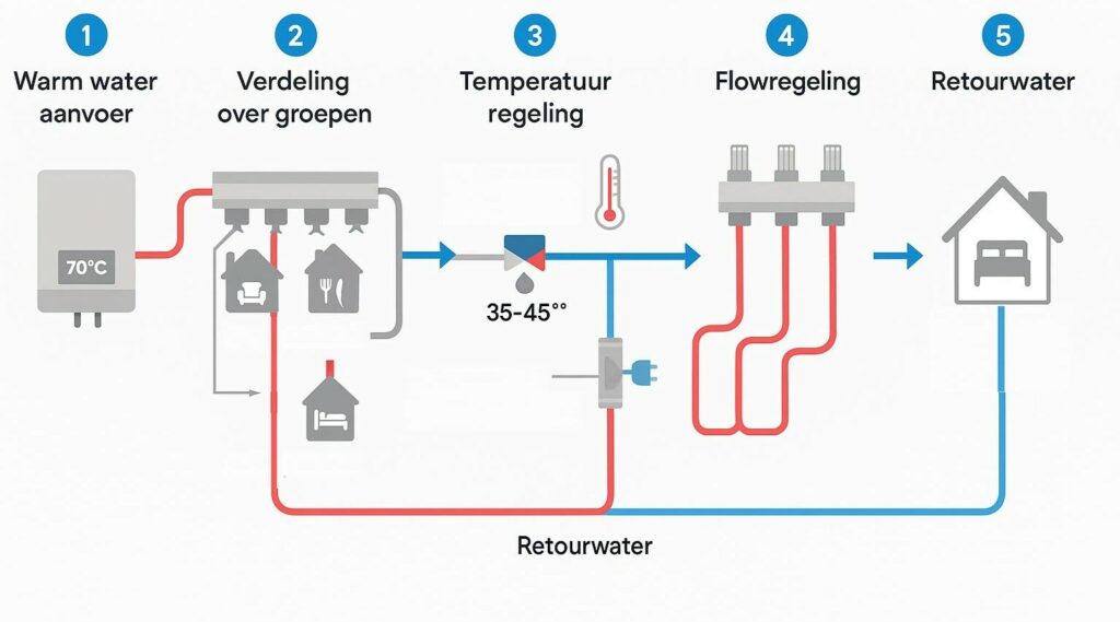 Het werkingsprincipe van een vloerverwarming verdeler is eigenlijk vrij eenvoudig te begrijpen. Het hele proces verloopt in vijf logische stappen: