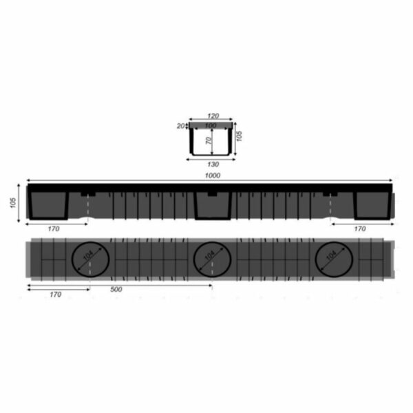 Afvoergoot met gietijzeren rooster 1000 mm lang x 130 mm breed x 105 mm hoog. Artikelnummer: 0074.